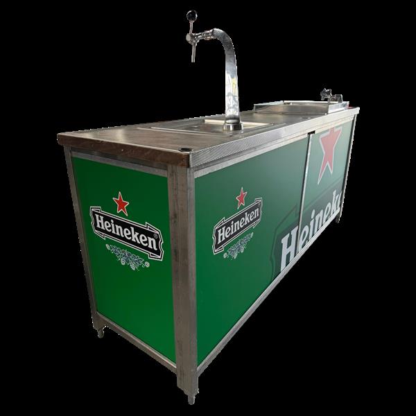 De robuuste RVS ombouw met herkenbare Heineken branding geeft de installatie een professionele en representatieve uitstraling. De combinatie van RVS werkblad, praktische spoelbak en betrouwbare koeling maakt dit een complete en direct inzetbare tapoplossing.